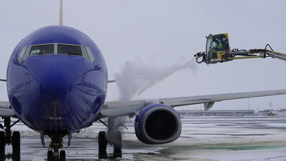 犹他州盐湖城国际机场,一架飞机起飞前进行除冰服务