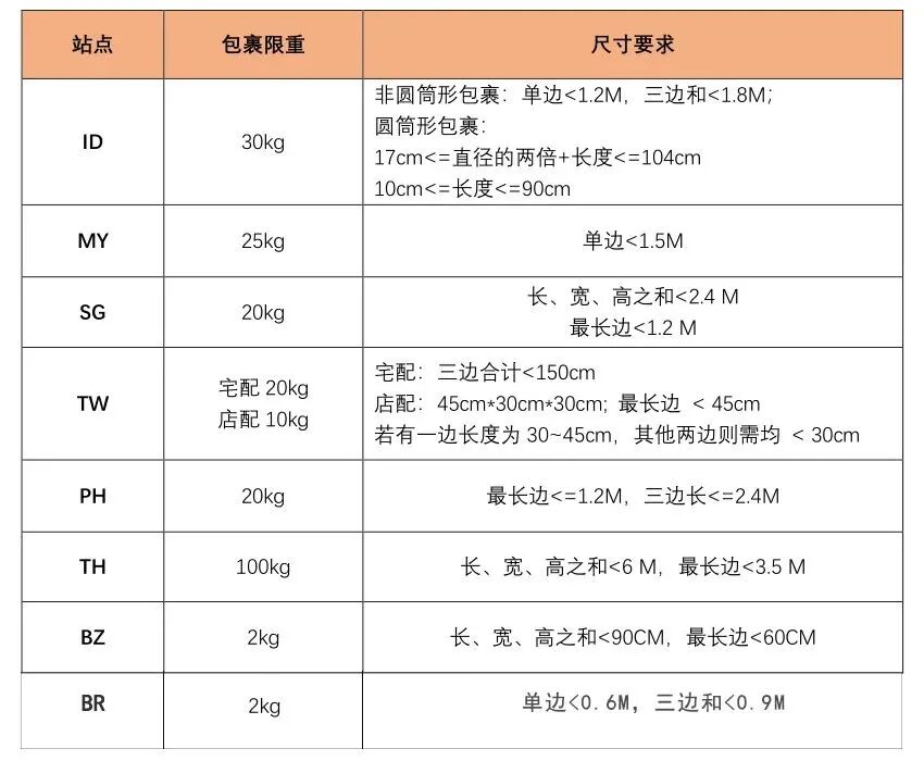 下面是shopee8个站点的包裹在重量,尺寸方面的要求: