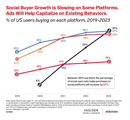 通过 TikTok shop 购买的 TikTok 用户比例呈爆炸式增长。它将在 2023 年与 Facebook 持平并超过 Instagram。TikTok 正在美国测试 TikTok Shop,有报道称它将推出供应链基础设施。该应用程序还推出了商业广告格式,例如商品目录广告。