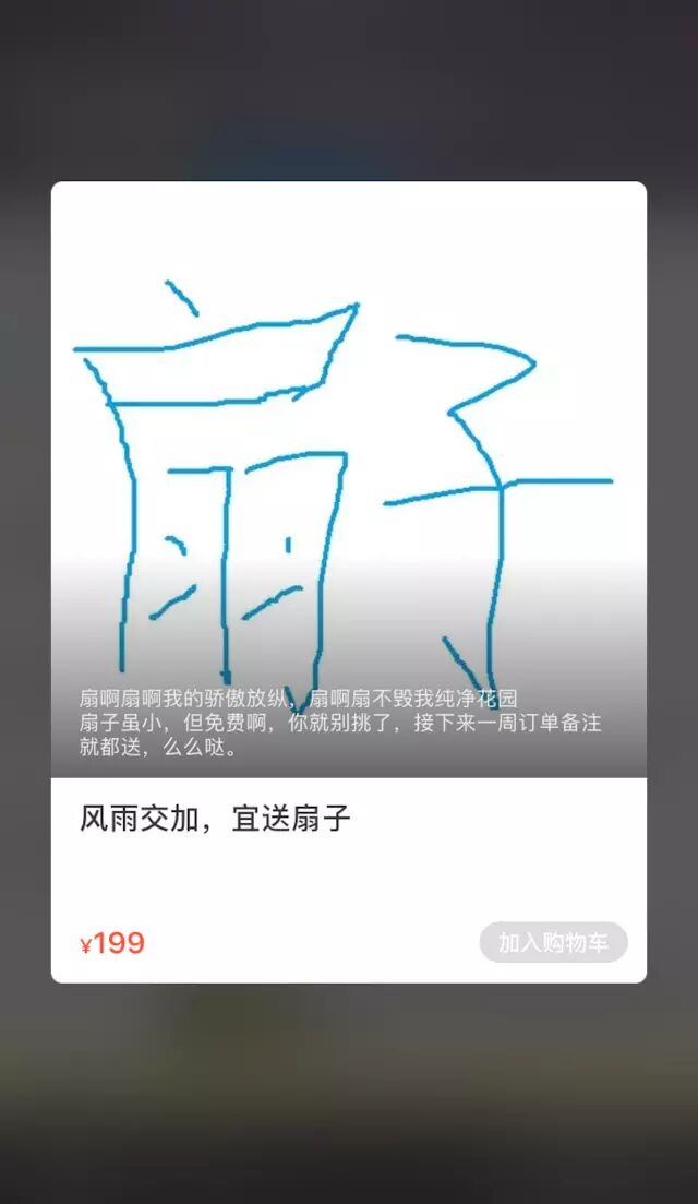 他家的赠品是扇子,据说“风雨交加,宜送扇子”,对饮品“冰糖雪梨”的描述是“冰糖雪梨让我懂得饮料不过是添加剂”,尤其是当你看到这些赤裸裸的语言,我表示墙都不扶只扶“饿了么”。