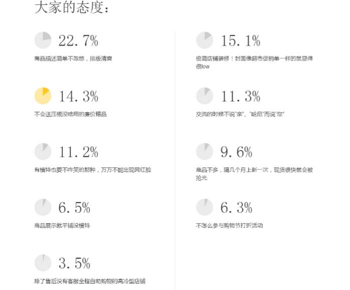 可见,在对一个店铺页面的信赖程度中,活动与客服并不是大多数顾客care的问题,如何能简单描述,极简陈列才是顾客对店铺信赖程度的决定因素。
