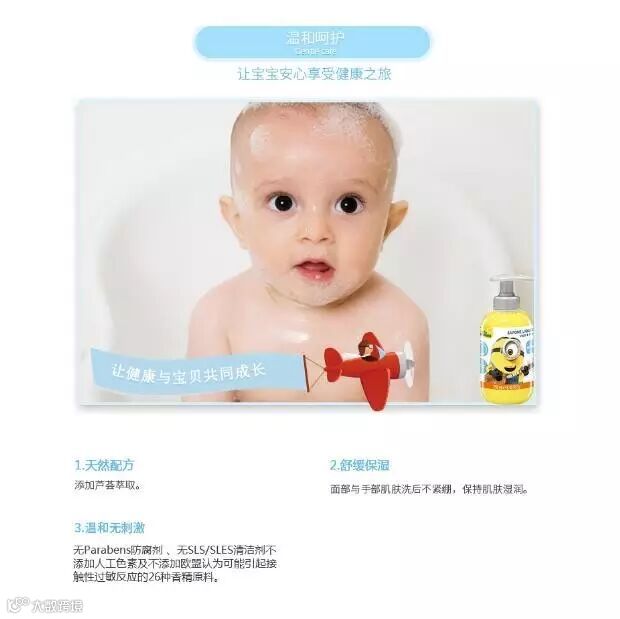 迪士尼小黄人香蕉香氛洗手洁面二合一,产地源自意大利,天然芦荟萃取原料,香味天然,不含过敏原,Parabens防腐剂和洁净剂SLS/SLES。可清洁脸部手部肌肤。使用方法:取适量于手心,轻柔后产生泡沫,涂抹于脸部或手部,按摩片刻后用清水冲洗干净。该产品适用于3岁以上年龄。