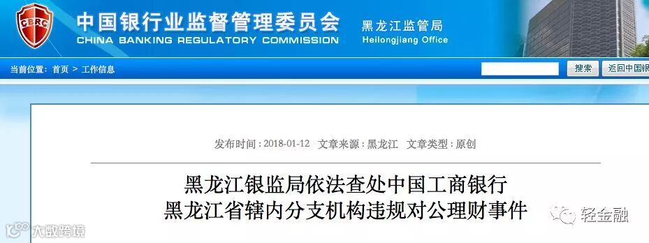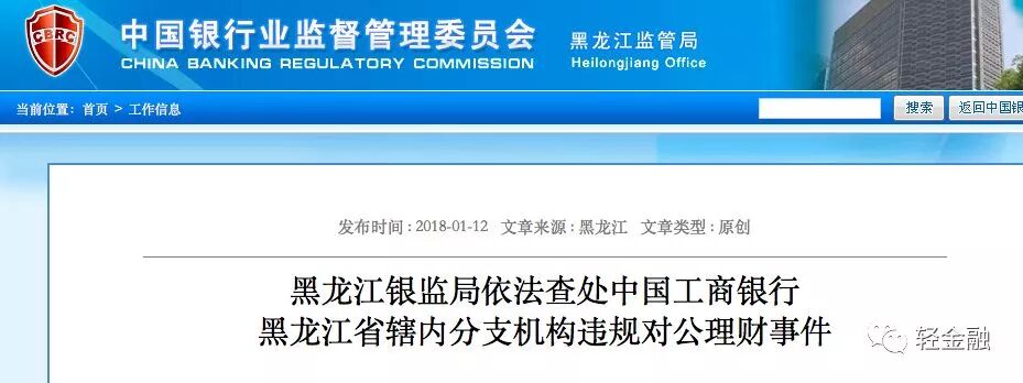 1月12日,黑龙江银监局发布消息称,经过立案、调查、审理、审议、告知等一系列法定程序后,至2018年1月11日,依法查处了中国工商银行黑龙江省辖内分支机构6支、共计54.7亿元的违规对公理财事件,涉案银行包括工行黑龙江省分行及所辖13家二级分行。