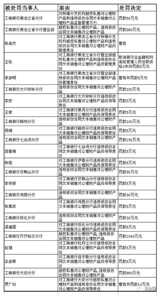 具体来看,工行黑龙江省分行及所辖13家二级分行及责任人合计被罚3400万元,其中机构罚款3310万元,高管人员罚款90万元,有15名高管人员取消任职资格、警告等处罚。黑龙江省银监局责令工行黑龙江省分行按照党规党纪、政纪和内部规章,对有关责任人给予纪律处分。