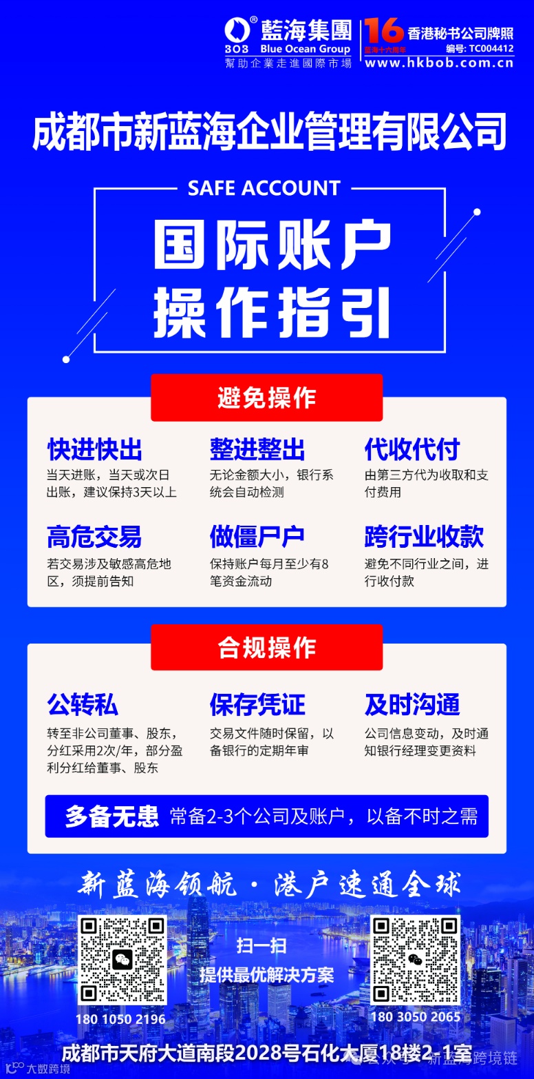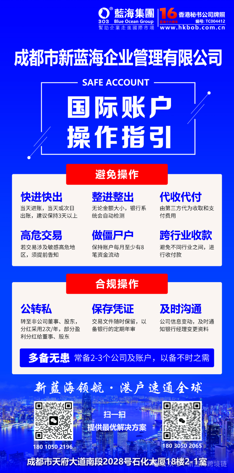 成都市新蓝海企业管理有限公司将在香港蓝海、深圳蓝海一体化运营下,帮助更多的国内企业打通“出海”通道,让更多优质产品和先进技术走向国际市场,同时,为外资企业来华提供更高效便捷的专业服务,全面促进开放型经济高质量发展,为谱写中国式现代化四川篇章贡献力量。