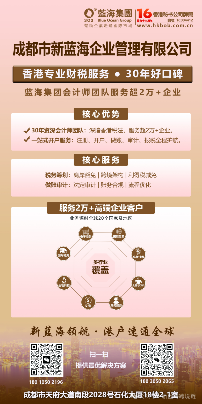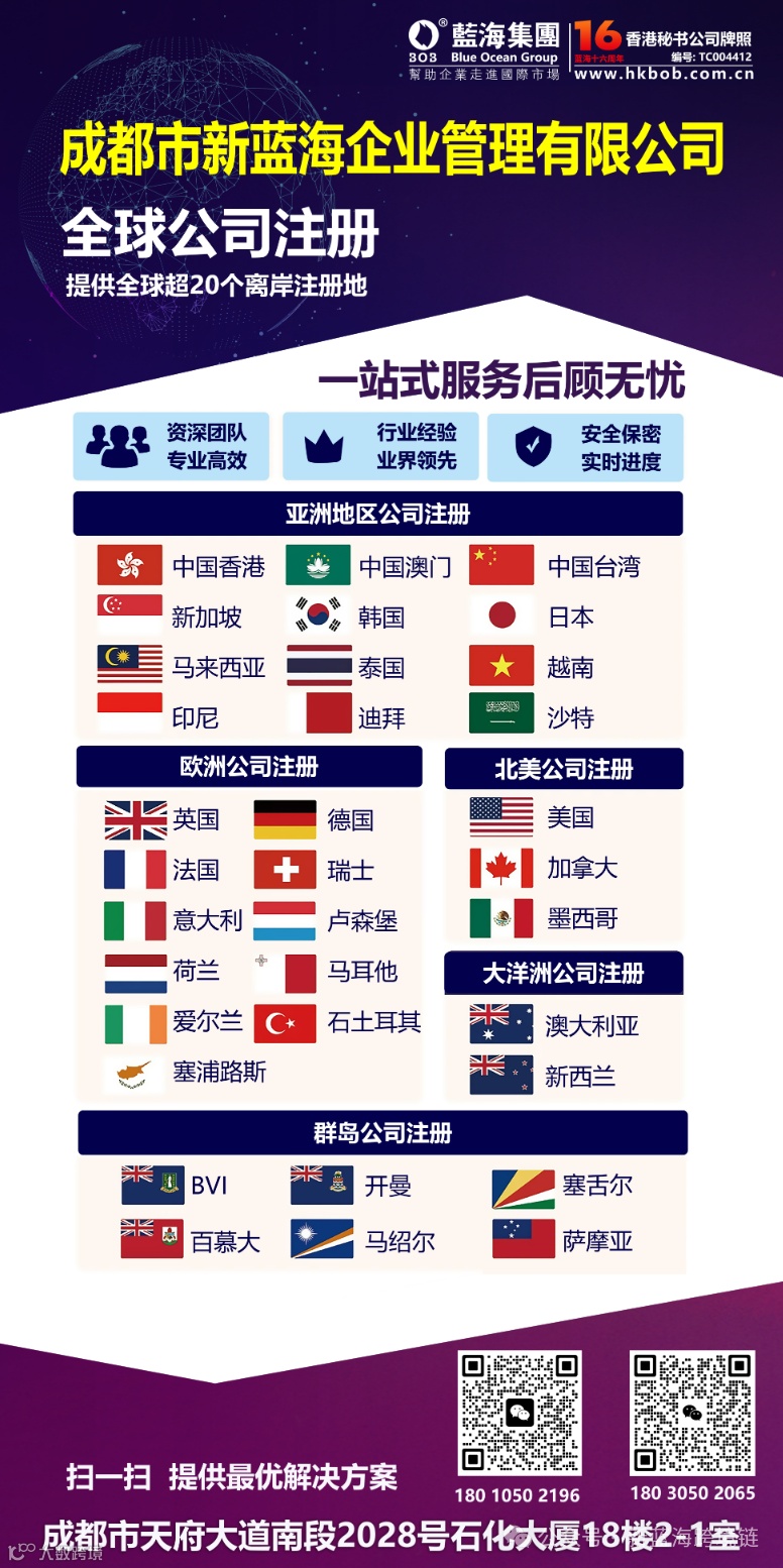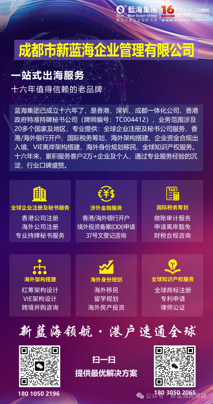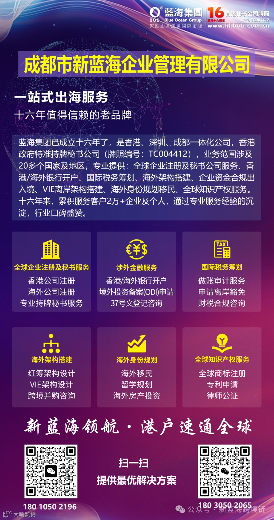成都市新蓝海企业管理公司于2025年4月落户四川天府新区石化大厦,我公司是香港蓝海集团为响应国家关于新时代推进西部大开发形成新格局战略号召,在成都设立的帮助企业出海、外资企业来华投资提供“一站式”综合服务的公司。