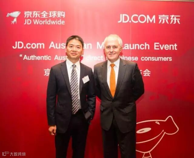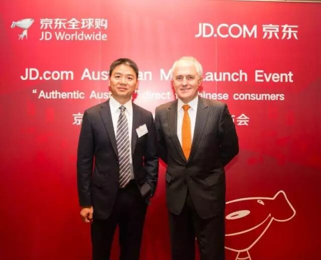 【2015年6月京东全球购澳大利亚招商会上京东集团CEO刘强东与澳大利亚联邦总理(时任澳大利亚通讯部长)MalcolmTurnbull亲切合影】