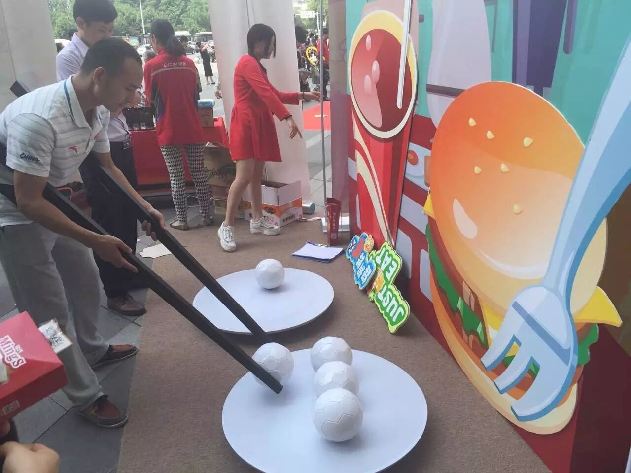 1. 手持巨型筷子将球从一个盘子移动到另一个盘子,引来众多群众的积极参与