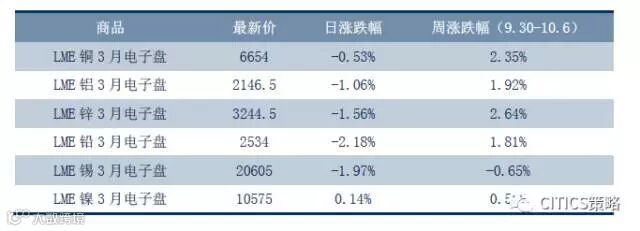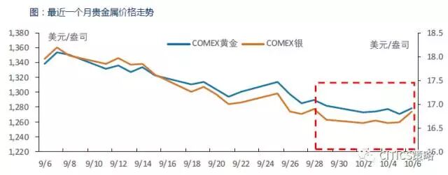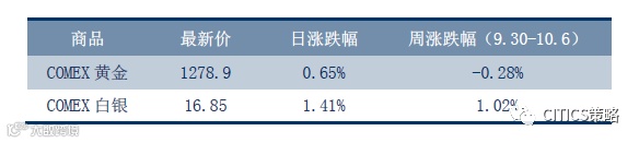 本周贵金属走势分化。周五(10.6)COMEX黄金上涨0.65%,收于1278.9美元/盎司,周跌幅0.28%。COMEX白银上涨1.41%,收于16.85美元/盎司,周涨幅1.02%。