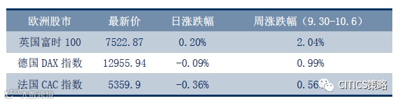 本周欧洲三大股指普涨,但是周五(10.6)涨跌互现,英国富时100指数收涨0.2%,报7522.87点,周涨2.04%,创2017年迄今最大单周涨幅。法国CAC指数收跌0.36%,报5359.90点,周涨0.56%;德国DAX指数收跌0.09%,报12955.94点,周涨0.99%。