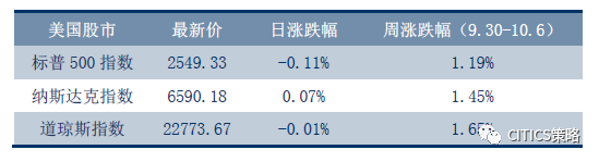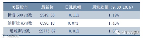 标普500指数周五(10.6)收盘小跌0.11%,报2549.33点,终结了六日连创纪录新高走势,主因非农数据不及预期,打击市场人气。此外,制药股下跌给标普500带来的拖累比较大,主要原因在于担心来自亚马逊的竞争。此前CNBC报导称,亚马逊接近于决定出售处方药。标普500指数周涨幅1.19%。纳斯达克指数连续上涨九日,并连续第六日创纪录最高收盘点位,周五纳指收涨0.07%,报6590.18点,今年第55次创造收盘纪录。周涨幅1.45%。周五道琼工业指数收跌0.01%,至22,773.67点。周涨幅1.65%。
