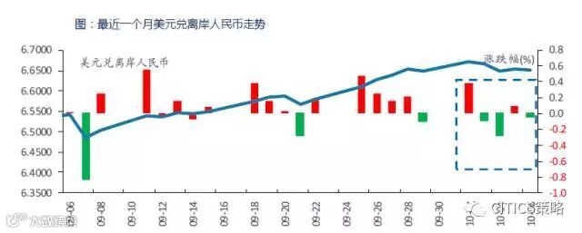 国庆假期在岸人民币未开市,离岸人民币震荡微跌。周一(10.2),离岸人民币微跌0.38%,收于6.6730;周二(10.3)扭跌回升涨0.08%,收于6.667;周三(10.4)继续上涨0.2895%,收于6.6477;周四(10.5)微跌0.098%,收于6.6542;周五(10.6)再次逆转回升,涨0.045%,收于6.6512。本周美元兑离岸人民币整体微跌0.05%。