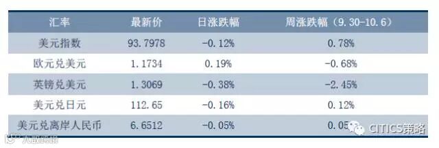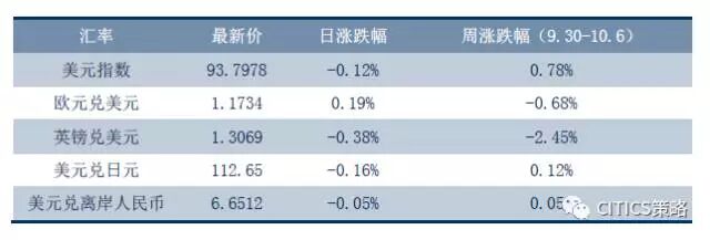 周五(美东时间)美元指数小幅下跌,日内稍早出炉的美国9月非农就业报告显示,就业人数意外减少3.3万,但薪资和失业率表现靓丽,美元飙升。但俄国家杜马议员访问朝鲜后表示,平壤决心继续进行导弹试验,有关各方必须及早干预。消息传来之后,美元指数则回吐了非农之后的全部涨幅转而下滑,收于93.7978,日跌幅0.12%。但是综合来看,本周受强劲经济数据支撑和年底美联储加息预期的影响,美元指数仍然实现了连续第四周上涨,周涨幅0.78%。