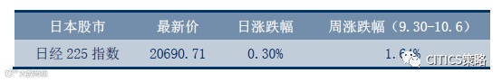 日经225指数本周持续上涨,10月6日(周五)收盘涨0.30%,报20690.71点,周涨幅1.64%。一方面,美国近期发布的经济数据向好,隔夜美股持续上涨,受此影响,东京股市连日攀升。另一方面,美国旧金山联邦储备银行行长Williams在5日表示支持美联储年内再次加息,美国加息预期上升,日美利差扩大的预期使得日元继续小幅贬值,进一步支撑东京股市走高。
