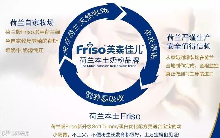 Friso来自拥有140多年历史的荷兰皇家菲仕兰坎皮纳公司,是真正的原装进口奶粉。我们从源头开始就严格把关,从原奶到罐装均在荷兰本地进行,全程监控,确保安全稳定的产品表现。