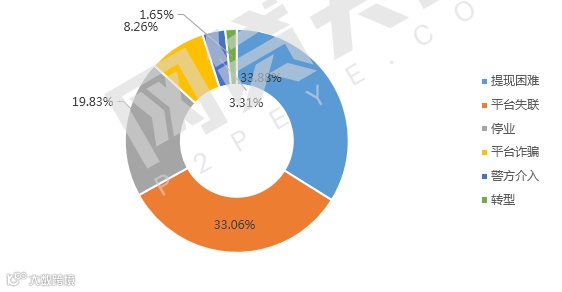 2017年9月,新增问题平台主要以提现困难和平台失联为主,据统计,121家问题平台中,41家平台提现困难,40家平台失联,占本月新增问题平台总数的33.88%,其次以平台停业为主,达24家,占问题平台总数的19.83%,此外,有10家平台诈骗、2家平台转型,还有4家平台警方介入。