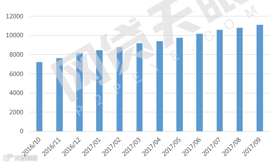 贷款余额是平台历史累计应还的贷款总量,能够反映平台在一段时间内的业务规模发展情况,贷款余额增加的越快,表示该平台业务扩张的越快。总览行业近一年变化,贷款余额总体呈单边快速增长态势,截至2017年9月底,贷款余额达11078.75亿元,环比增长2.85%,是去年同期的1.62倍。