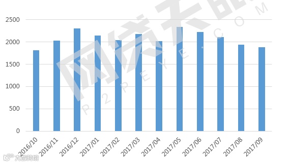 2017年9月,P2P网贷行业全国成交额为1879.29亿元,环比下降3.21%,同比上涨9.71%。进入2017年监管年,成交额呈波动性发展的态势,从2017年年中至今,成交额已连续下降4个月,下降的原因可能是随着各项监管政策不断出台,各地区对网贷行业实施不同力度的监管合规,同时近期合规监管一再收紧,影响了投向网贷行业借款人的数量。此外,在监管持续推进的大环境下,预计近期网贷行业成交额可能略显消沉,未来监管合规完全落地,资金面逐渐相对放松,网贷行业成交额还有望再度突破高位。