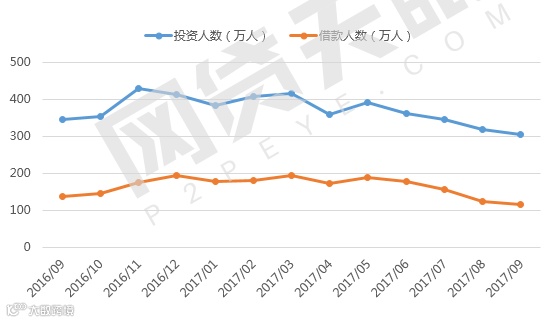 2017年9月,网贷行业的投资人数达307万人,借款人数达115万人,本月投资人数环比下降3.95%,借款人数环比下降6.19。从2016年9月到2017年9月,近13个月投资人数累计4826万人次,借款人累计2139万人次。