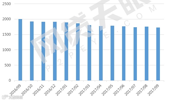 2017年9月,网贷行业在运营平台数量为1732家,相比上个月有所下降,同比下降13.66%,自2016年8月份《暂行办法》划定13条监管红线后,各地监管措施也不断落地,已经有超六成网贷平台被淘汰。随着行业发展在监管指引下走向正轨,行业竞争也将日趋激烈,未来二八定律逐渐显现,淘汰平台也将再次增多,在运营平台或将降至一稳定值水平。