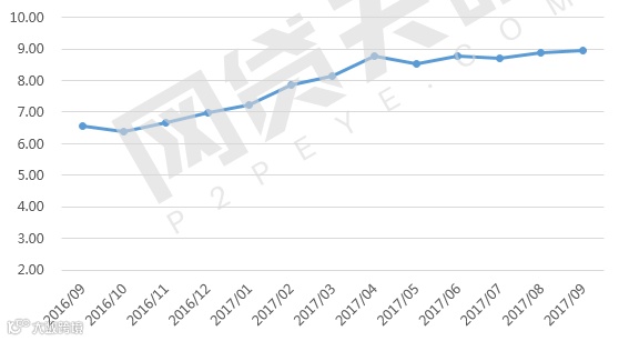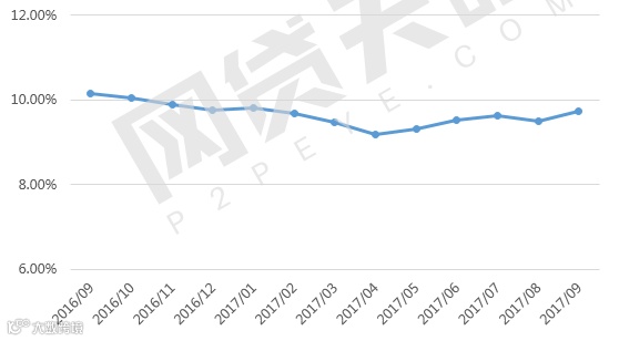 2016年9月至2017年9月,网贷行业的综合利率整体为下降趋势,但相差不足一个百分点,本月网贷行业平均综合利率为9.74%,相比上月高出0.26个百分点。可能是由于市场资金紧张,使得资金市场利率不断攀升,整个金融体系面临的压力增加,网贷行业也受到影响,部分平台相继举办加息活动,致使近期利率微升。