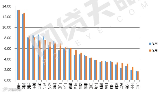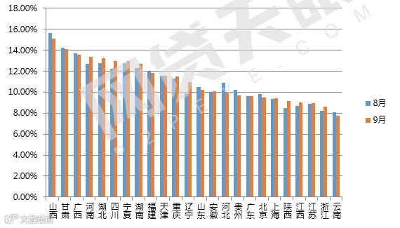 总体来看,24个地区中12个地区平均利率高于行业平均水平,北京、广东、上海三个地区利率目前均在9.35%左右。利率低于9%的地区有江苏、浙江和云南,浙江平均综合利率为8.60%。