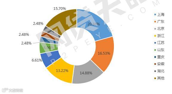 2017年9月,新增问题平台121家,121家问题平台分布在全国21个地区,分布范围较广,其中上海地区本月新增25家问题平台,占比总体的20.66%,广东地区本月新增20家问题平台,占比总体的16.53%,其次北京地区本月新增18家问题平台,占比14.88%,浙江地区本月新增问题平台16家,其余地区本月新增问题平台不足10家。