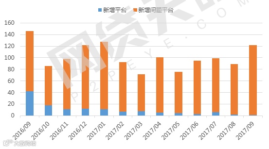 2017年9月新增问题平台121家,新增平台仅1家,相比上月,新增问题平台环比增长39%。自2017年以来,新增平台逐步减少,且新增问题平台总数是新增平台总数的9.2倍。可见,随着互联网金融专项整治方案的实施,无法达到P2P网贷行业标准的平台将逐步被淘汰出局,准备上线的平台阻力重重,致使P2P网贷行业每月新增平台数量持续处于较低水平,新增问题平台较多。