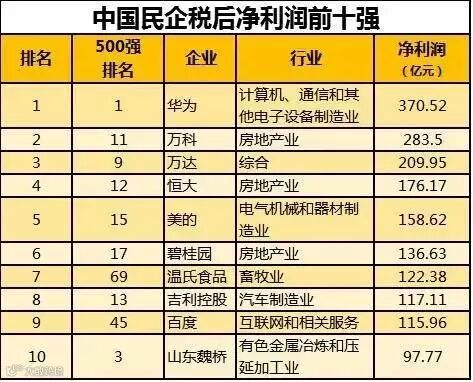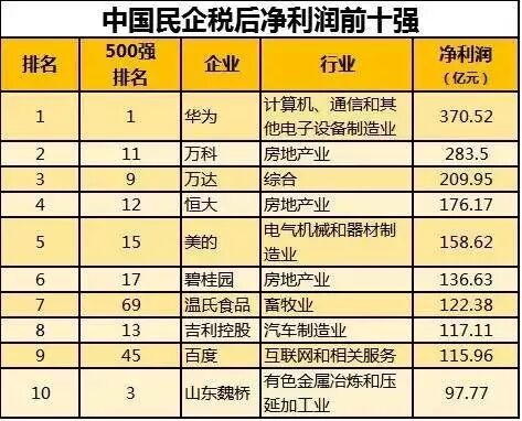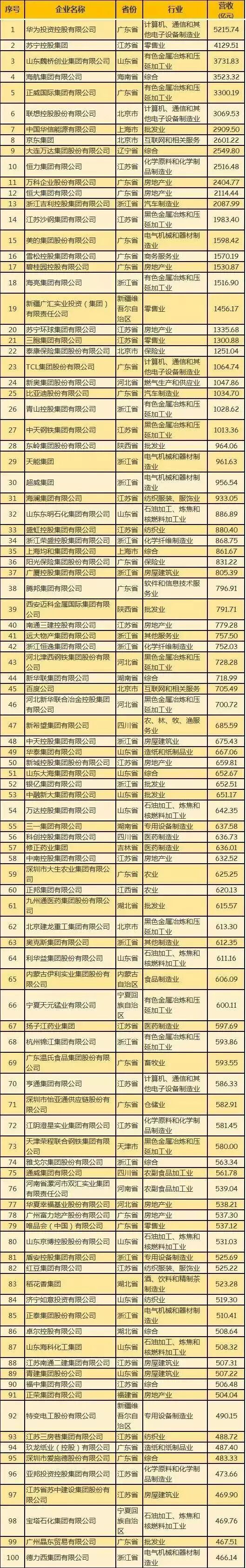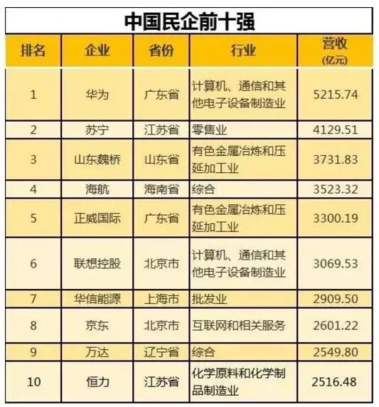 其中有6家企业营收突破3000亿元,分别是:华为、苏宁控股、山东魏桥、海航、正威国际、联想控股。