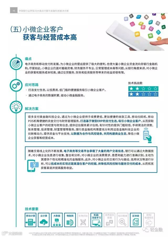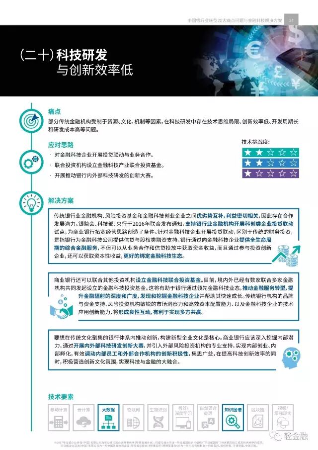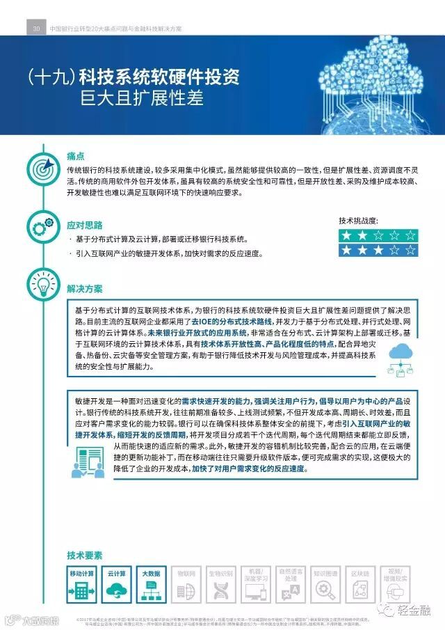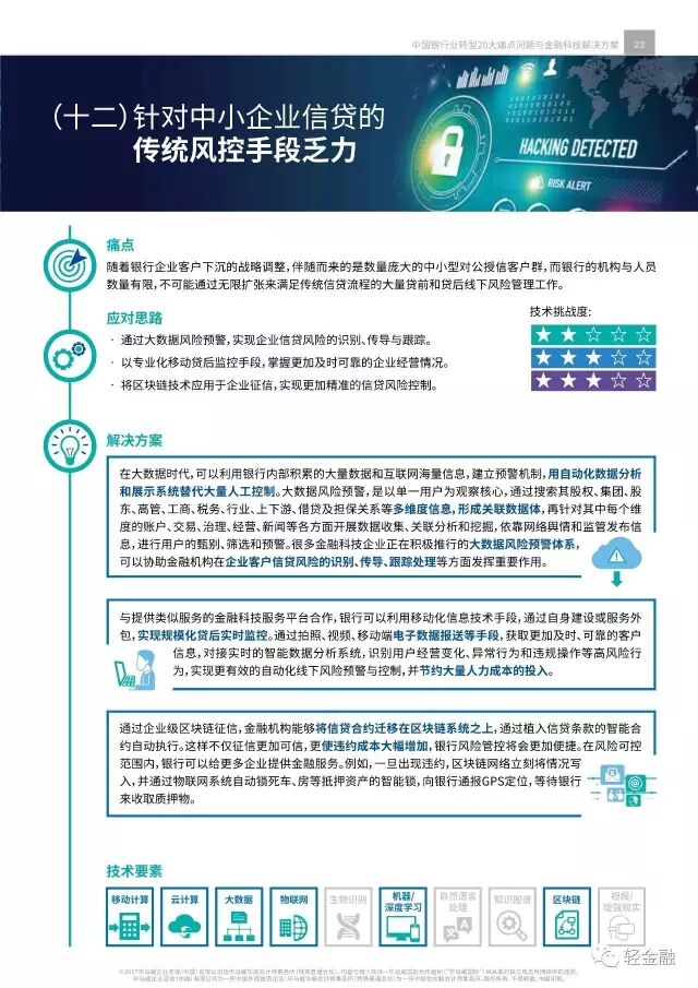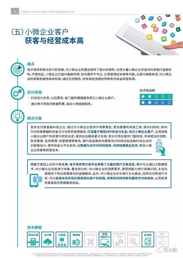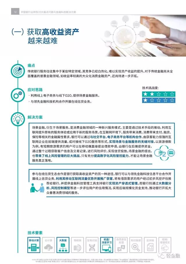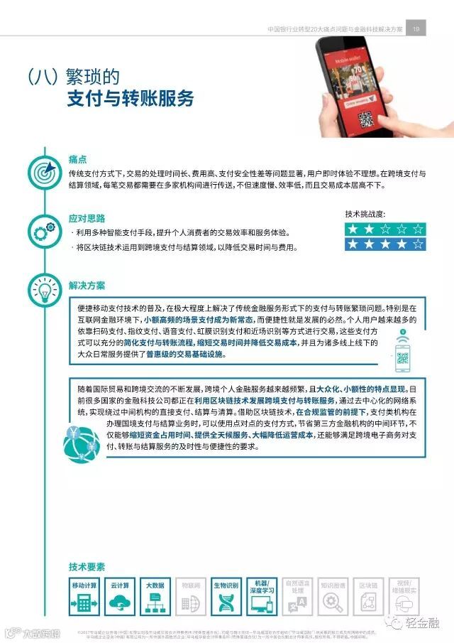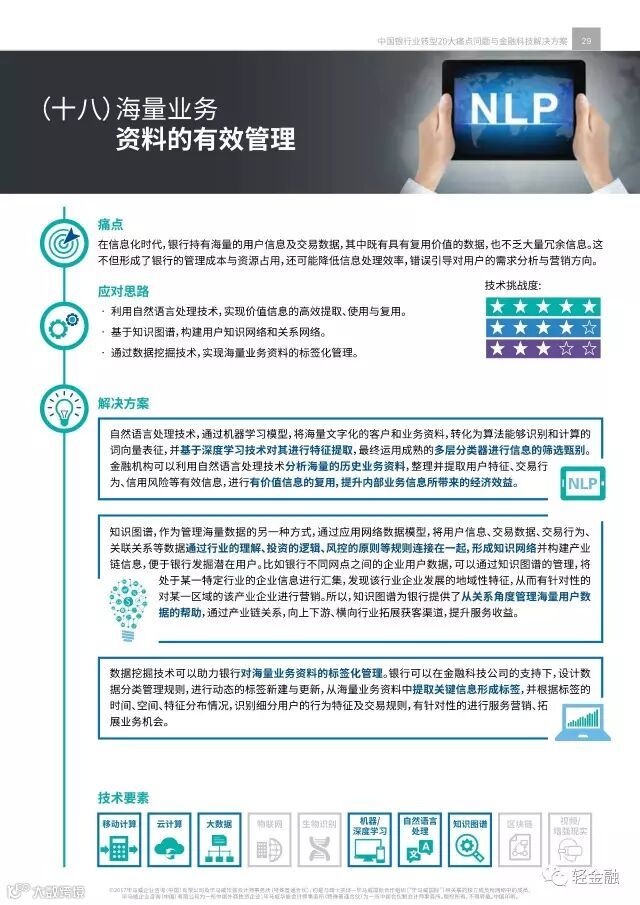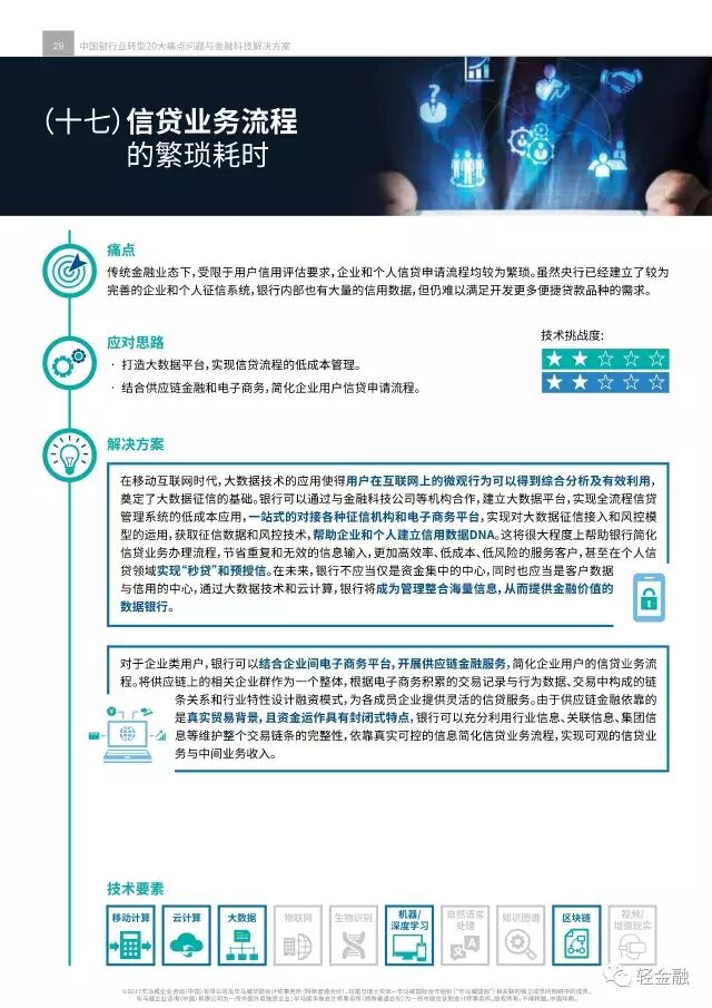 近日,毕马威发布《中国银行业转型20大痛点问题与金融科技解决方案》报告,从银行业商业经营中所面对的20大行业共性痛点问题出发,总结了金融科技业态对这些痛点的创新应对思路与落地实施方案。