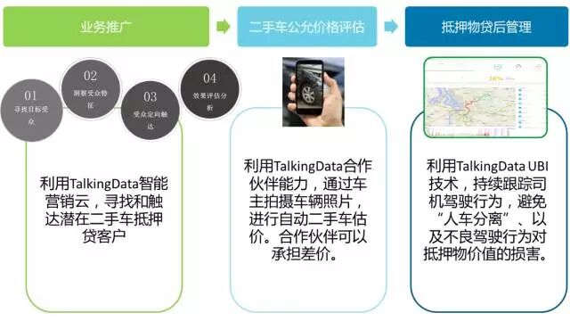 利用数字营销能力,做场景导流,帮助银行解决大规模受众覆盖的问题;利用人工智能和大数据技术,能线上实现二手车价值评估;利用情景感知技术,能实现抵押物贷后管理中诸如“不良驾驶行为”、“人车分离”等方面的风险识别。