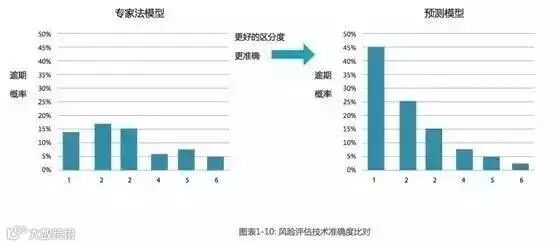 与之形成鲜明对比的是,基于大数据分析的预测模型能够大幅提升预测的准确性,不同分段的风险概率区分度高,最好分段的未来逾期概率只有3%左右,最差分段的未来逾期概率高达45%,区分度高更有利于针对不同客户设计不同策略。