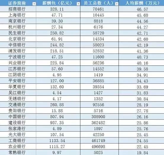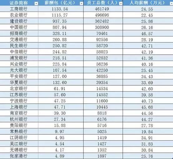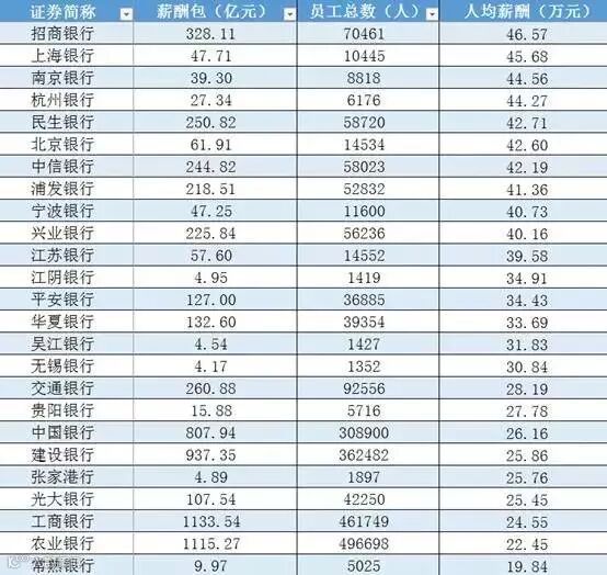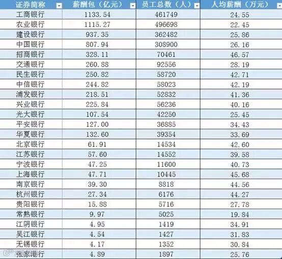 从2016年薪酬情况来看,国有四大行无论是薪酬总量还是员工人数,都可以碾压其他股份制银行。四大行人均薪酬平均为24.75万元,其中中国银行员工薪酬最高,农业银行薪酬最低。
