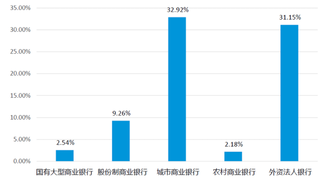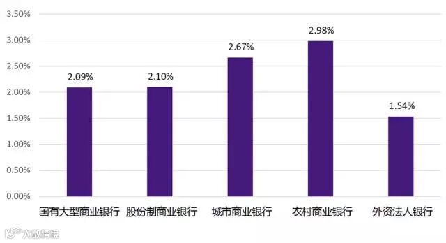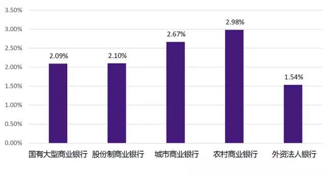 2016年,城市商业银行和农村商业银行净息差水平相对较高,均值达2.67%和2.98%,国有大型商业银行和股份制商业银行平均净息差略高于2%,而外资法人银行以平均1.54%的净息差处于较低水平。