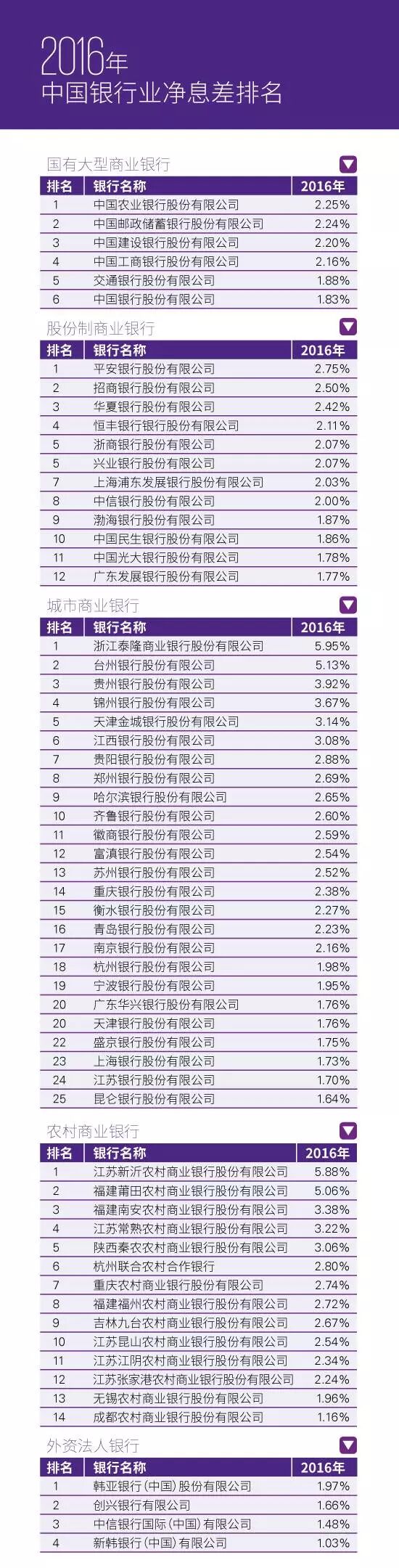 毕马威于2017年7月27日发布了《2017年中国银行业调查报告》,本期专题分享中,按国有大型商业银行、股份制商业银行、城市商业银行、农村商业银行和外资法人银行分类,对《2017年中国银行业调查报告》中展示的200家银行2016年的净利润增长率和净息差两大盈利能力指标进行了排名。净利润增长率排名包括了《2017年中国银行业调查报告》中全部200家银行的数据,净息差排名则为200家银行中对外披露净息差数据的61家银行。