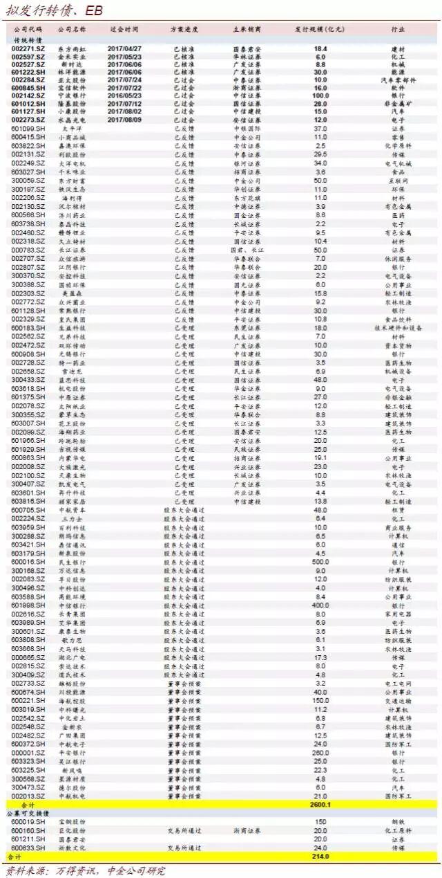 目前来看,转债估值得到了一定程度上的调整,但指数趋势也被破坏,潜在需求群体可能会选择暂时观望。此外,未来的供给仍不会少,传统转债审批略有提速,最近的水晶光电从预案到过会,时间只有3个月。我们上周还提到,此前股市大涨过后,EB发行人与投资者之间更容易达成共识,发行容易成行,仍然值得注意。因此,暂不期待转债估值的快速反弹。