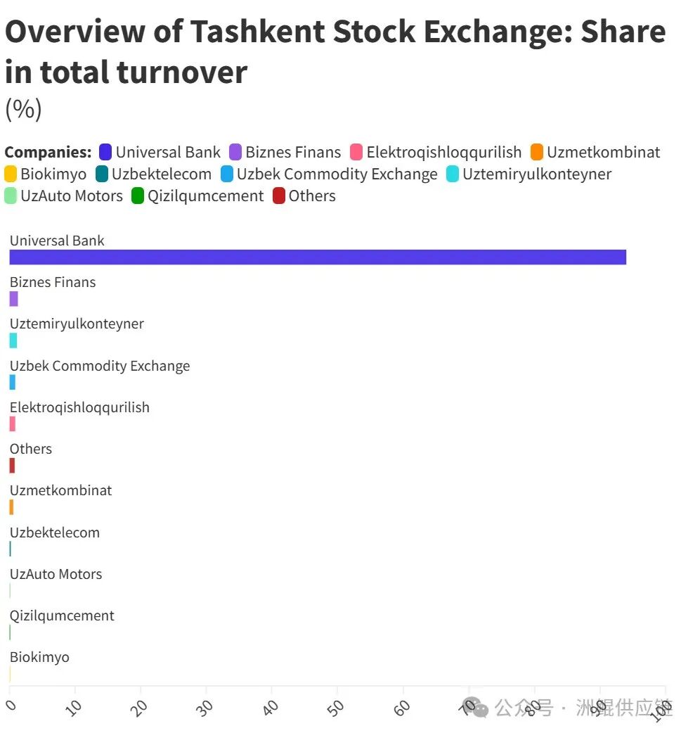 同期,94%的成交额来自于 UNVB 股票的交易,以每股 5,000 乌吉亚(0.40 美元)的价格成交了 509 亿乌兹别克斯坦索姆(约合 405 万美元)。这些交易可能是公司董事会主席安瓦尔-伊尔查耶夫先生进一步增持公司股份的一部分。此前,他已将其在公司的股份从 4.99% 增加到 5.11%,每股 8000 乌苏姆(0.64 美元),总计 25 亿乌兹别克斯坦索姆(198817 美元)。