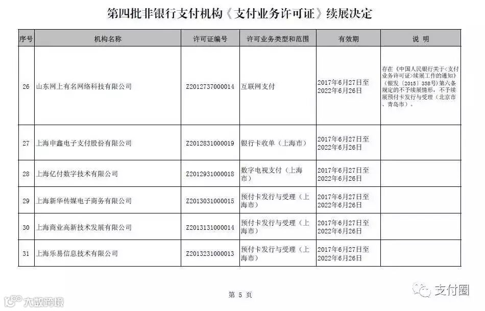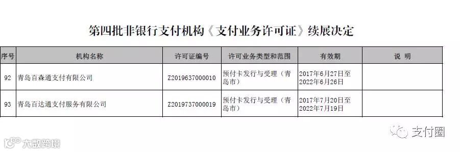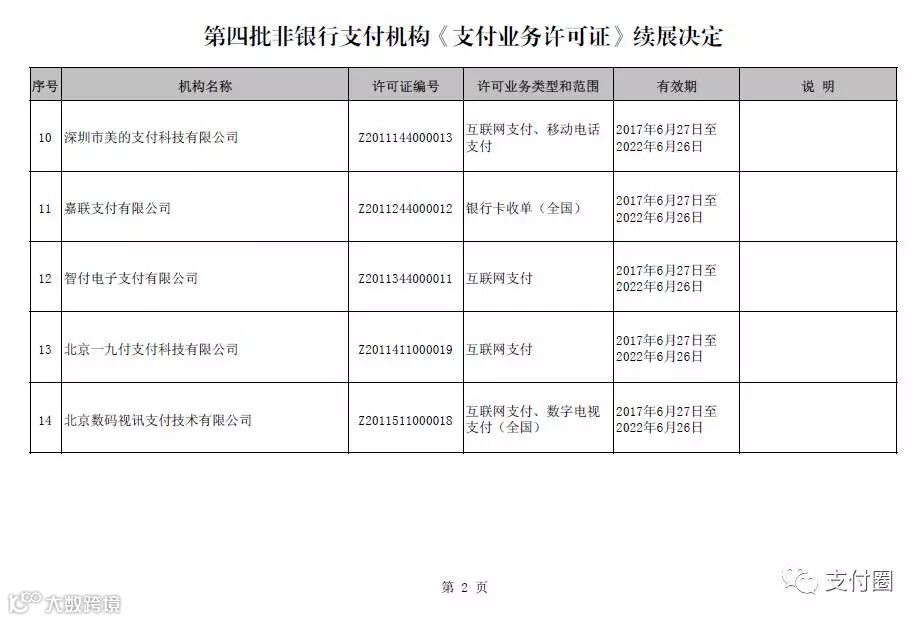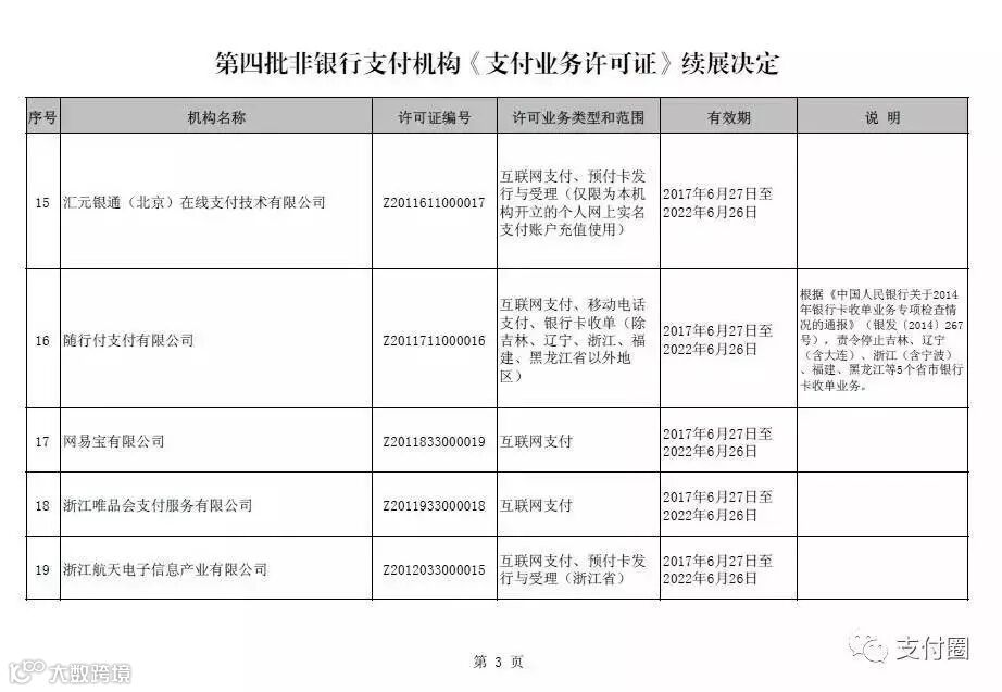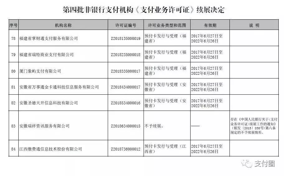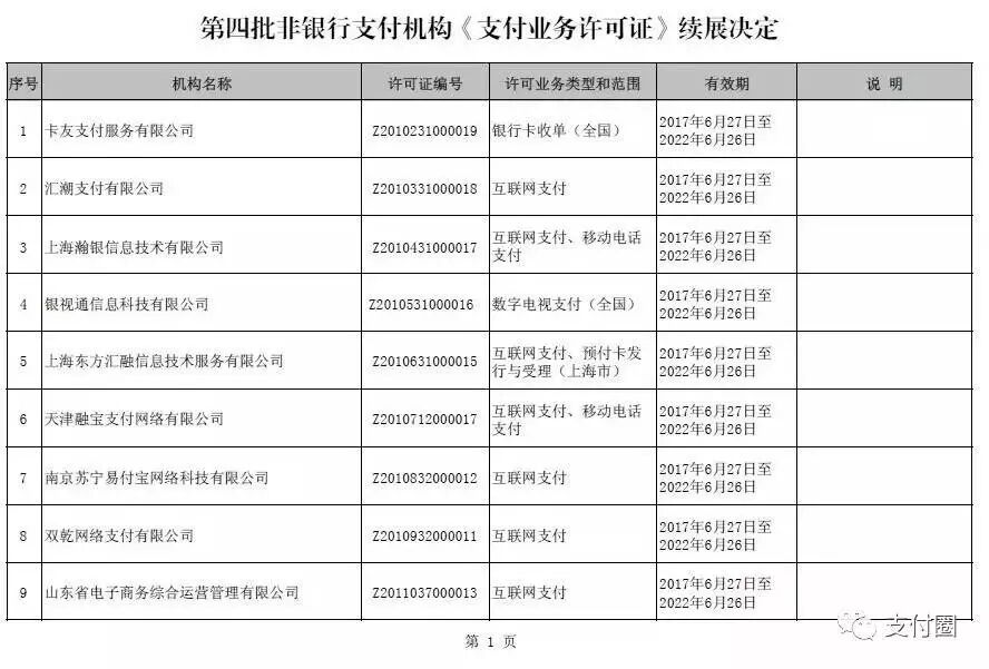 今天下午,支付圈从中国人民银行官网获悉,支付牌照第四批次已经过人民银行的续展审核完毕,牌照续展结果出炉。支付牌照有效期增至2022年6月26日。