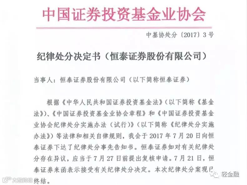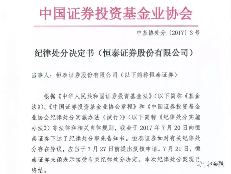 根据《中华人民共和国证券投资基金法》(以下简称《基金法》)、《中国证券投资基金业协会章程》和《中国证券投资基金业协会纪律处分实施办法(试行)》(以下简称《纪律处分实施办法》)等法律和相关自律规则,我会于2017年7月20日向恒泰证券下达了纪律处分事先告知书。恒泰证券如对有关纪律处分存在异议,应当于7月27日前提出复核申请。7月21日,恒泰证券来函表示接受有关纪律处分决定。本次纪律处分案现已终结。