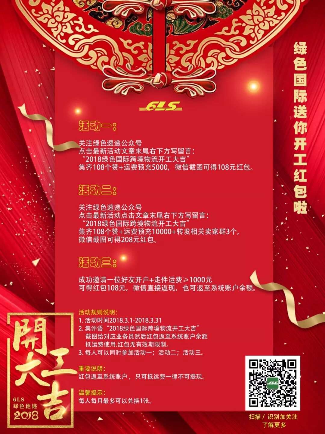 点击文章末尾右下方写留言:“2018绿色国际跨境物流开工大吉”集齐108个赞+运费预充5000,微信截图可得108元红包。