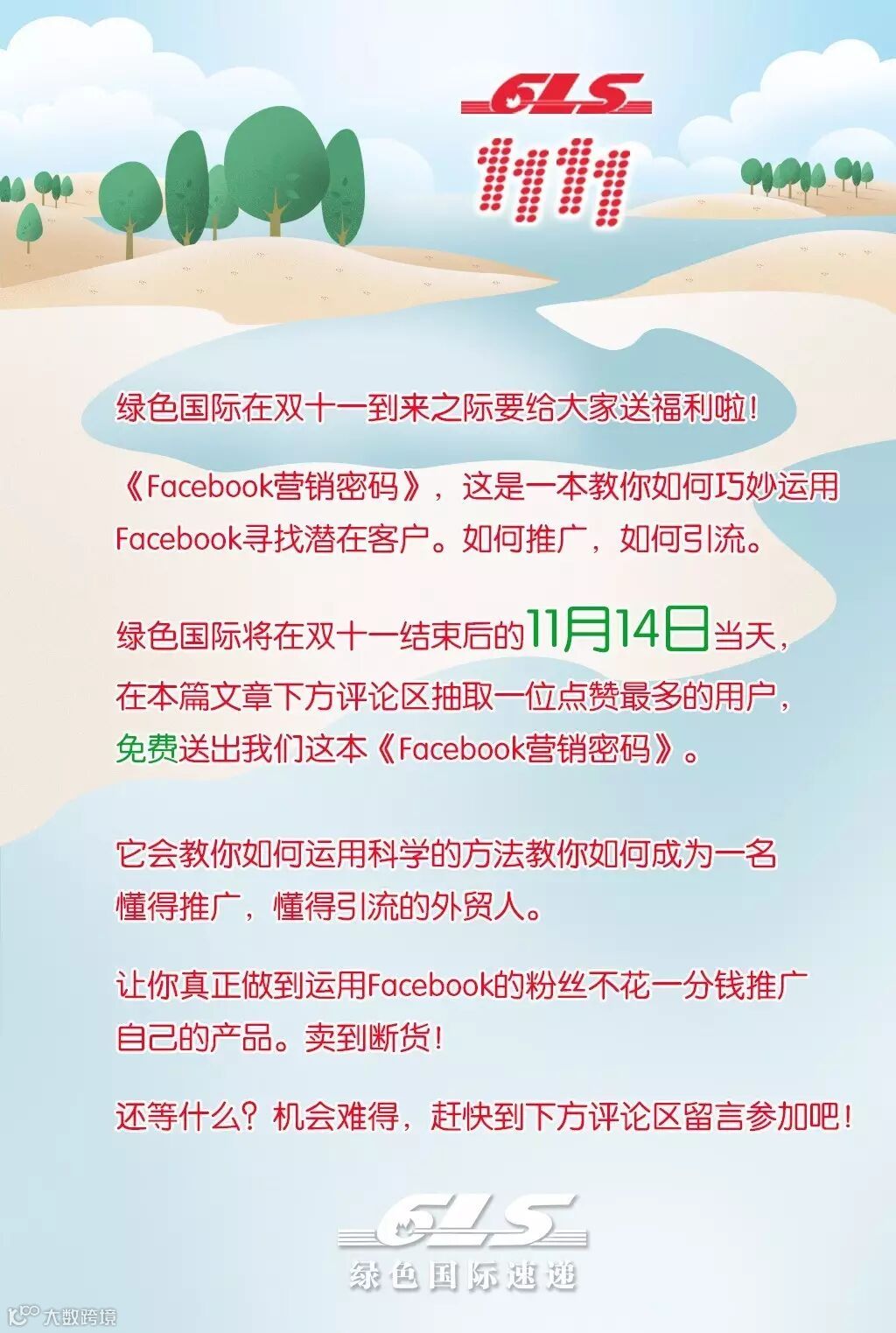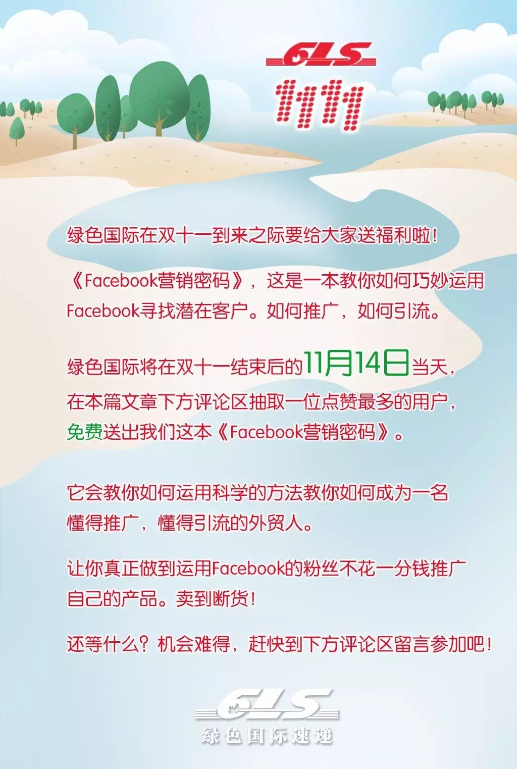 绿色国际将在双十一结束后的11月14日当天,在本篇文章下方评论区抽取一位点赞最多的用户,免费送出我们这本《Facebook营销密码》。