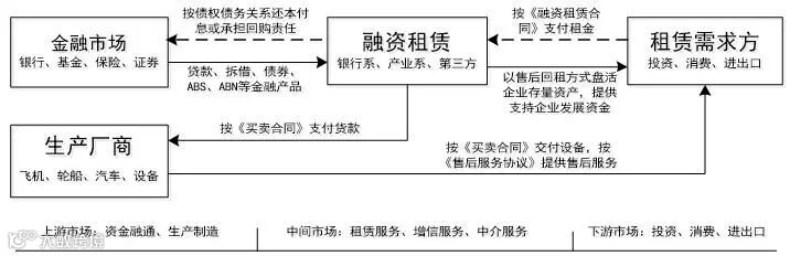 从融资租赁企业的运行模式看,因融资租赁企业不能吸收公众存款(金融租赁公司可吸收非银行股东3个月(含)以上的定期存款),只能在金融市场融资,然后通过一定的交易结构设计与安排(直租、回租等),以“以物融资”、“以租促销”的方式将资金直接或间接输送至租赁需求方,并以此实现资金在金融市场、融资租赁企业、租赁需求方、生产厂商之间的运用与回流,形成以融资租赁企业为核心的产业链效应,推动实体经济发展。在整个产业链条中,不仅包括融资方、融资租赁企业、生产厂商和租赁需求方,也包括了会计事务所、评估机构、律师事务所、担保机构等相关产业。因此,融资租赁企业的运行模式决定了其在促进投融资领域、制造业领域、增信产业、中介服务产业、消费、投资、进出口等方面都具有积极的拉动作用。