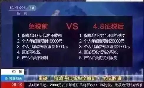 央视新闻报道,财政部、海关总署、国家税改总局发布通知,经国务院批准,从2016年4月8日将实行新的跨境电子商务零售进口税收政策。