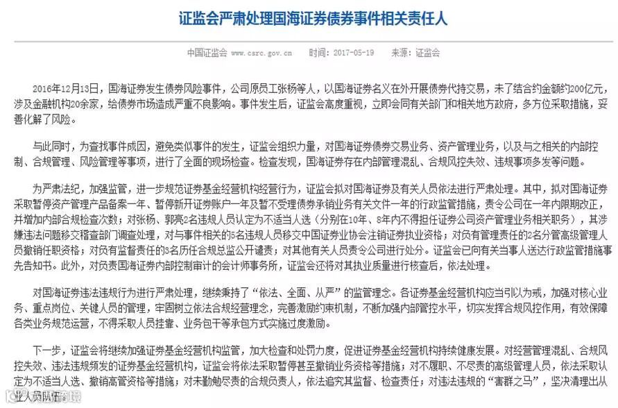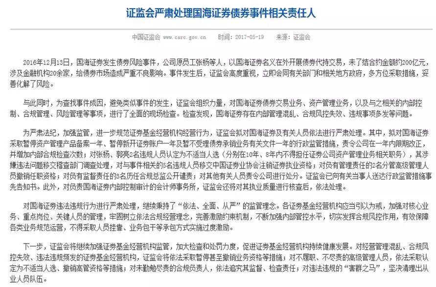 5月19日,证监会新闻发言人张晓军表示,证监会拟对国海证券依法进行严肃处理,责令国海证券一年内限期改正,增加内部合规次数。