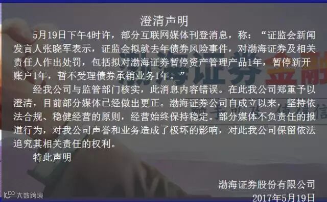 但因为传播广泛影响已形成,渤海证券刊出了一份澄清声明,强调公司坚持依法合规稳健经营,未被处罚。