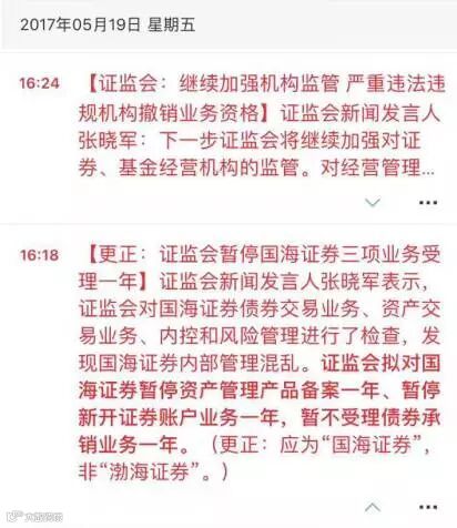 在证监会发言人张晓军多次在发布会现场确认是国海证券而非渤海证券后,误发媒体赶紧更正。