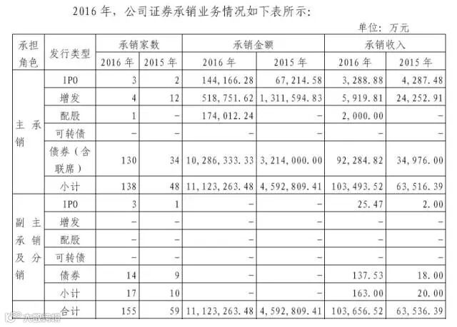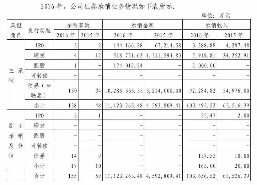 2 2016年,全年股权、债券承销收入同比增长63.15%,股票及债券主承销金额排名行业第16位,债券主承销金额排名行业第15位,股票及债券主承销家数排名行业第12位,债券主承销家数排名行业第11位。。