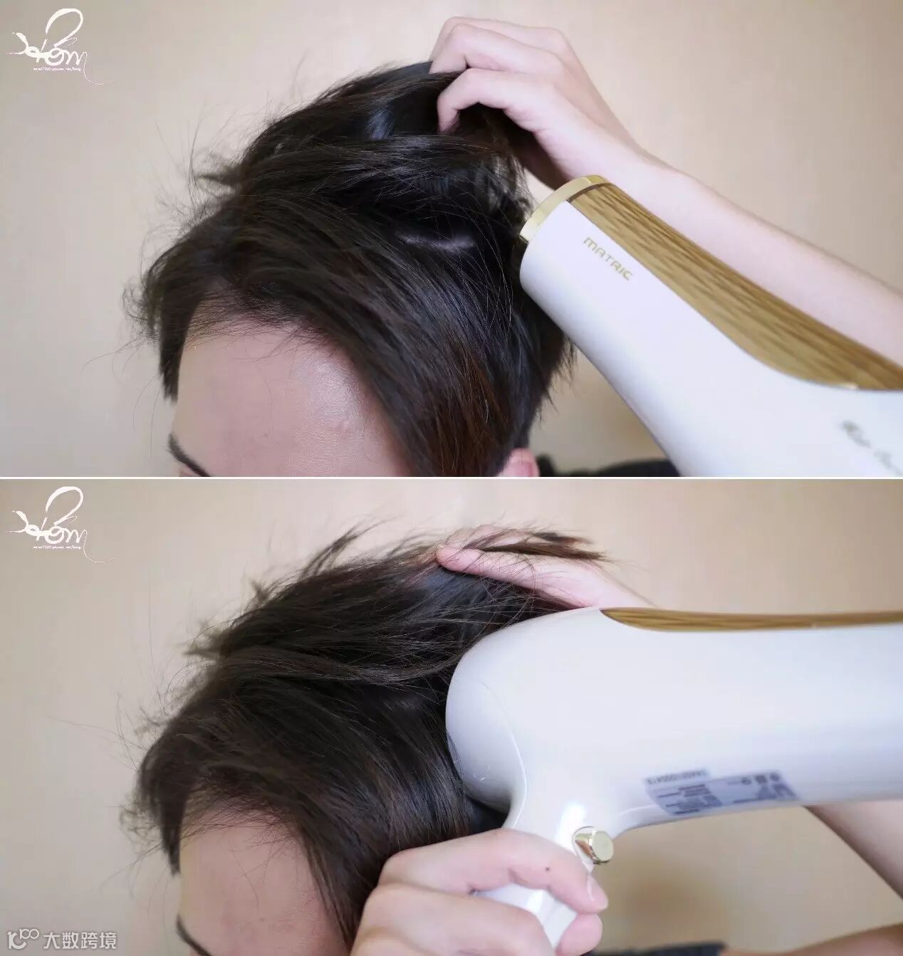首先要在需要打造蓬松感的头顶和后脑勺部分逆吹。用手夹起头发,逆着头发自然垂落的方向吹发根。或者就低头低头再低头,让头发可以垂落,那就不用拉头发,可以直接逆吹发根。一片一片部位吹,大概逆吹3、4秒钟发根,然后将吹风机反过来,用吹风机后面吸刚刚吹热的发根部分,大概也是3、4秒钟。刘海部分是逆吹还是顺吹就看自己想要的造型了。鬓角一般顺吹即可。