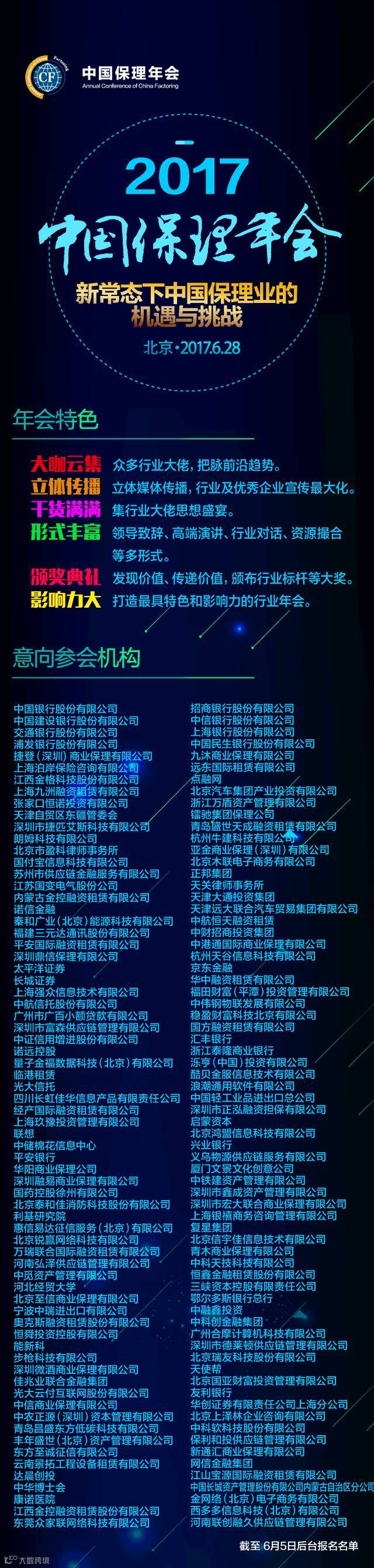 据悉,参加本次会议的将有多家业内重量级机构,如果你是保理行业相关从业者或者价值链的一环,本次年会将是你学习、开拓、交流、宣传的极好机会,这样的盛会。抓紧时间赶快报名参加吧!