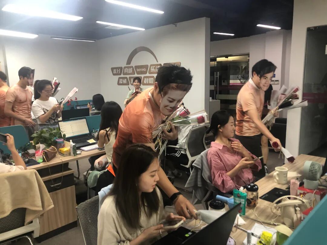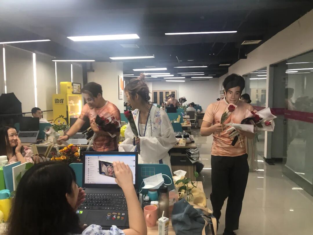 有了<爱在七夕>主题活动的预热,大家对七夕佳节的到来更加热情高涨。8月4日七夕节,上午10点,一场特殊的“猛男送花”悄然而至,由时颖帅哥们组成的临时偶像男团,为小伙伴们送上鲜花,像极了偶像剧里情节,点燃伙伴们的热情,也瞬间提高了大家的工作效率,为下午的活动时刻准备着。